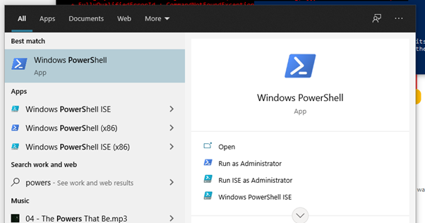 The first step is to open PowerShell in Admin mode from your start menu in Windows (type ‘powers’ in the search box next to the start menu icon, click Run as Administrator.