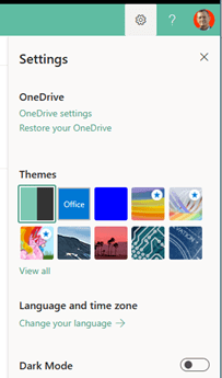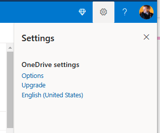 You might expect that the regional settings are accessible from the Settings cog wheel and opening it offers that hope. Click the Change your language link to visit the Account Settings page. You should make any changes you need here, but don’t get your hopes up yet, since I have never seen these have any effect on the dates displayed in the OneDrive files list. (You can use this URL to get to this same page: https://myaccount.microsoft.com/settingsandprivacy )