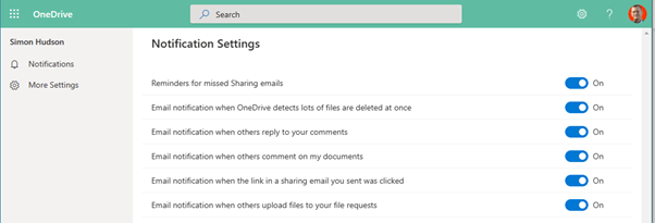 However, if you had, instead, chosen OneDrive Settings from the cog you would have arrived, unintuitively, at the Notifications Settings page, on which there is a discrete More Settings link