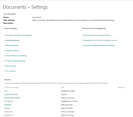 From the Regional Settings screen (see above) click Apps in the left navigation. You are now in the hidden Site Contents page (familiar to all SharePoint folk. You could also have changed onedrive.aspx to viewlsts.aspx in the URL). As I said at the start, OneDrive for Business is really a personal SharePoint Online Site Collection. All your OneDrive documents are in the site collection document library, so click the ellipsis next to Documents and choose Settings to arrive at the library settings screen (also familiar to SharePoint admins).