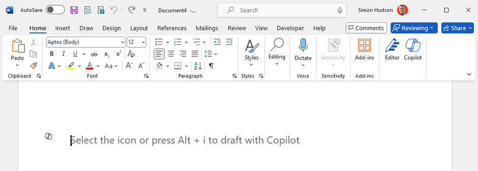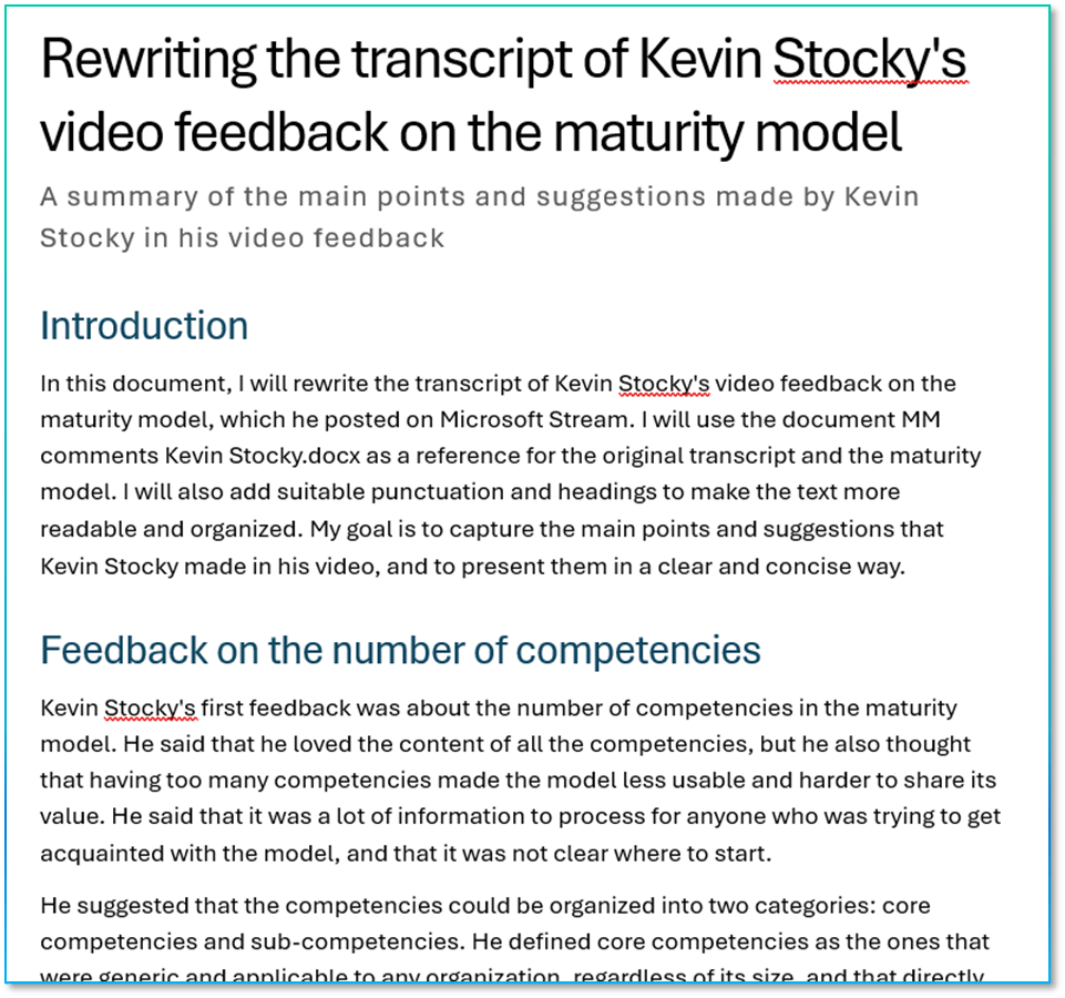 Note that Word won’t show you the prompt you used in-line after it has finished responding to the prompt.. This is bad and inconsistent with the behaviour of Copilot elsewhere (including the sidebar in Word). It also undermines one of the principles of the Cognitive Business Maturity Model, which is to capture and reuse effective prompts. Even worse, if you are fed up of waiting the Copilot to complete its task (we all have such short attention spans) it will often just stop generating the updated content and disappear. Not always, but often. Which means you have lost your carefully crafted prompt.