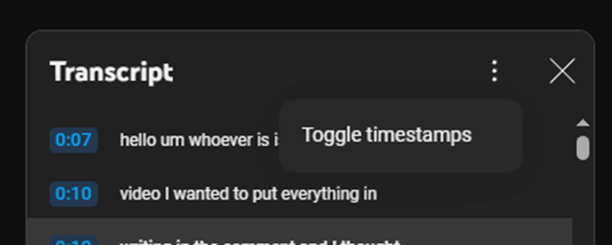 It became immediately obvious that it would be better without the time stamps; handily YouTube provides a Timestamp toggle in the transcript options menu