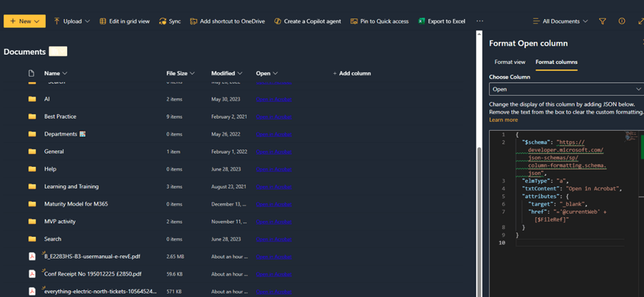 I created a text column called OpenPDF in a test SharePoint library on my tenant and we attempted to copy the JSON into it. After some frustration (some error was crept in whenever I copied the text from WhatsApp; but worked when the same was copied from a text file), we succeeded in getting SharePoint to accept the JSON. Sadly we got an unexpected 404 error when we used the link. For reasons I don’t understand, @currentWeb' + [$FileRef] created an unexpected URL, with part of the path duplicated. Edge Developer tools let us find it; F12 is our friend.