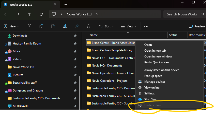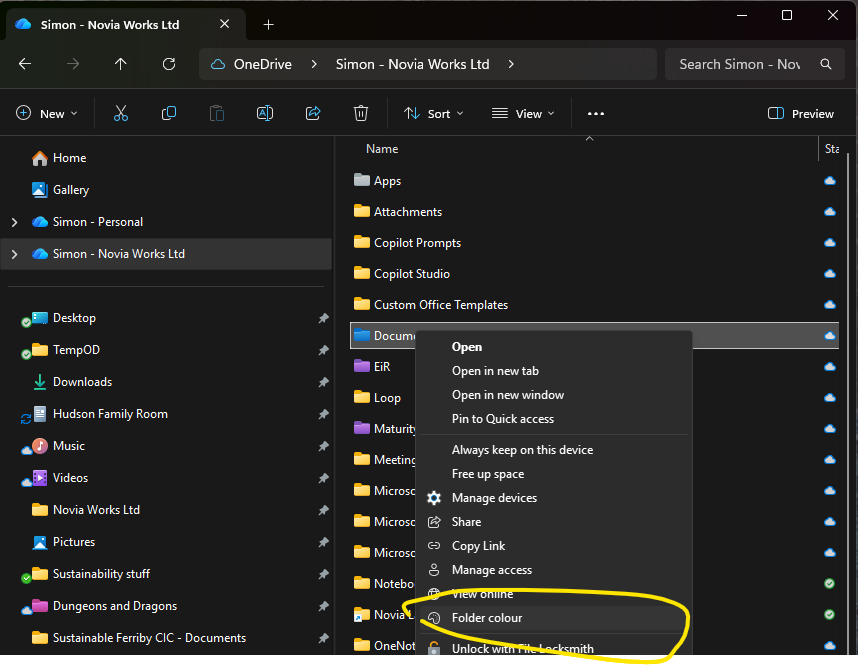 It would be nice if this were also true for OneDrive Personal, but it’s mostly not – you can set a folder colour on a sync’d OneDrive Personal folder, but the web client probably ignores it and doesn’t give you the option to set colours. Weirdly, the mobile app does respect the colours, though you can’t set them from the app. It might work for some people some of the time, but it depends on the OneDrive sync version & Windows version. It has appeared, disappeared, and reappeared across updates. At this point Microsoft has not formally documented or committed to folder colour for Personal accounts. Another nail in the coffin of a consistent UI.