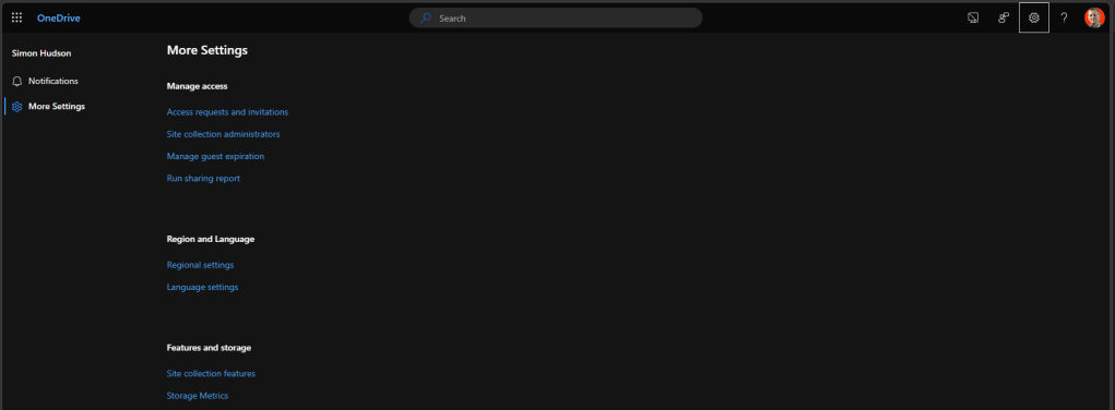 Site settings > Settings > OneDrive settings > More settings