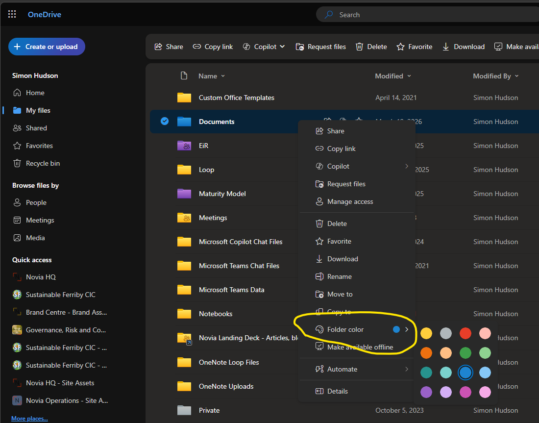 You, like me, might be a fan of applying colour to key folders as a way of differentiating them or providing a loose visual classification. It can be a great way of picking the most commonly used ones out of the sea of yellow (alongside pinning etc).